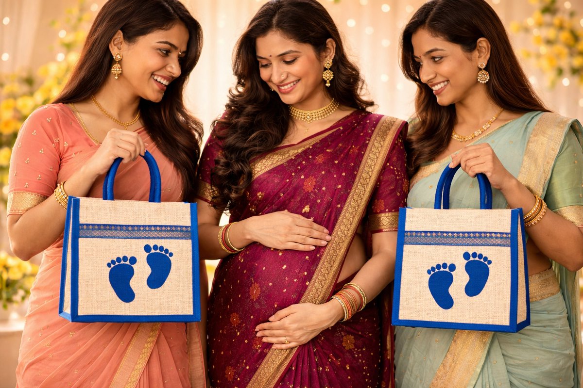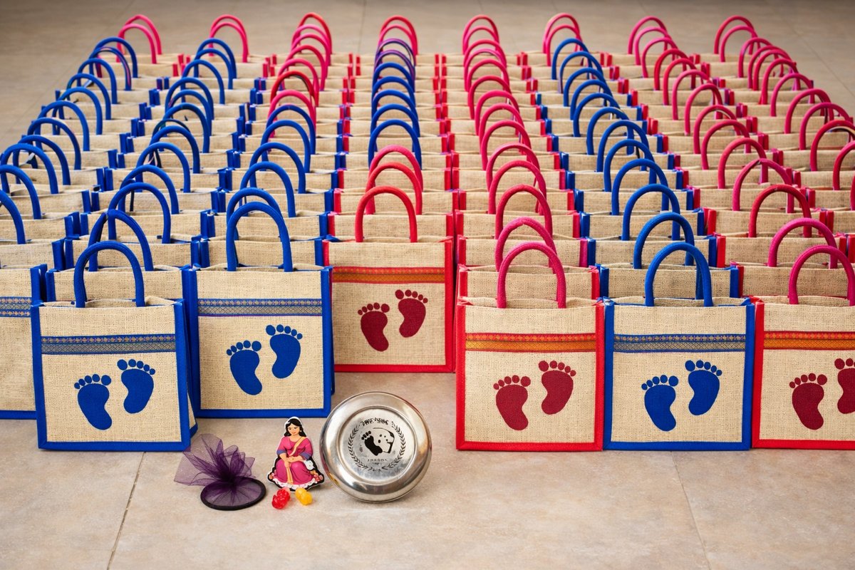 Make your baby shower celebration memorable with this beautifully curated return gift combo, combining elegance, tradition, and utility. This premium set features a 10×8×4 inch eco-friendly jute bag with adorable baby footprint design in a stylish blue theme. Inside, you’ll find a 4.5-inch engraved stainless steel box with a “Baby Shower – Thank You” message, along with traditional bangles and a haldi kumkum bottle set—perfectly arranged to create a meaningful gifting experience. Ideal for baby showers, seemantham, and traditional occasions, this combo is ready-to-gift and loved by guests. 📦 What’s Included: 👜 1 × Blue Jute Bag (10×8×4 inches) 🥣 1 × 4.5" Engraved Stainless Steel Box 💫 1 × Set of Wrapped Bangles 💛 1 × Haldi Kumkum Bottle Set Key Features: Premium quality, reusable & eco-friendly materials Perfect mix of modern design + traditional elements Compact, elegant & easy to carry Ideal for bulk gifting at events Ready-to-use combo – no extra packing needed Perfect For: Baby Shower / Seemantham / Valaikappu Naming Ceremony Return Gifts for Traditional Functions