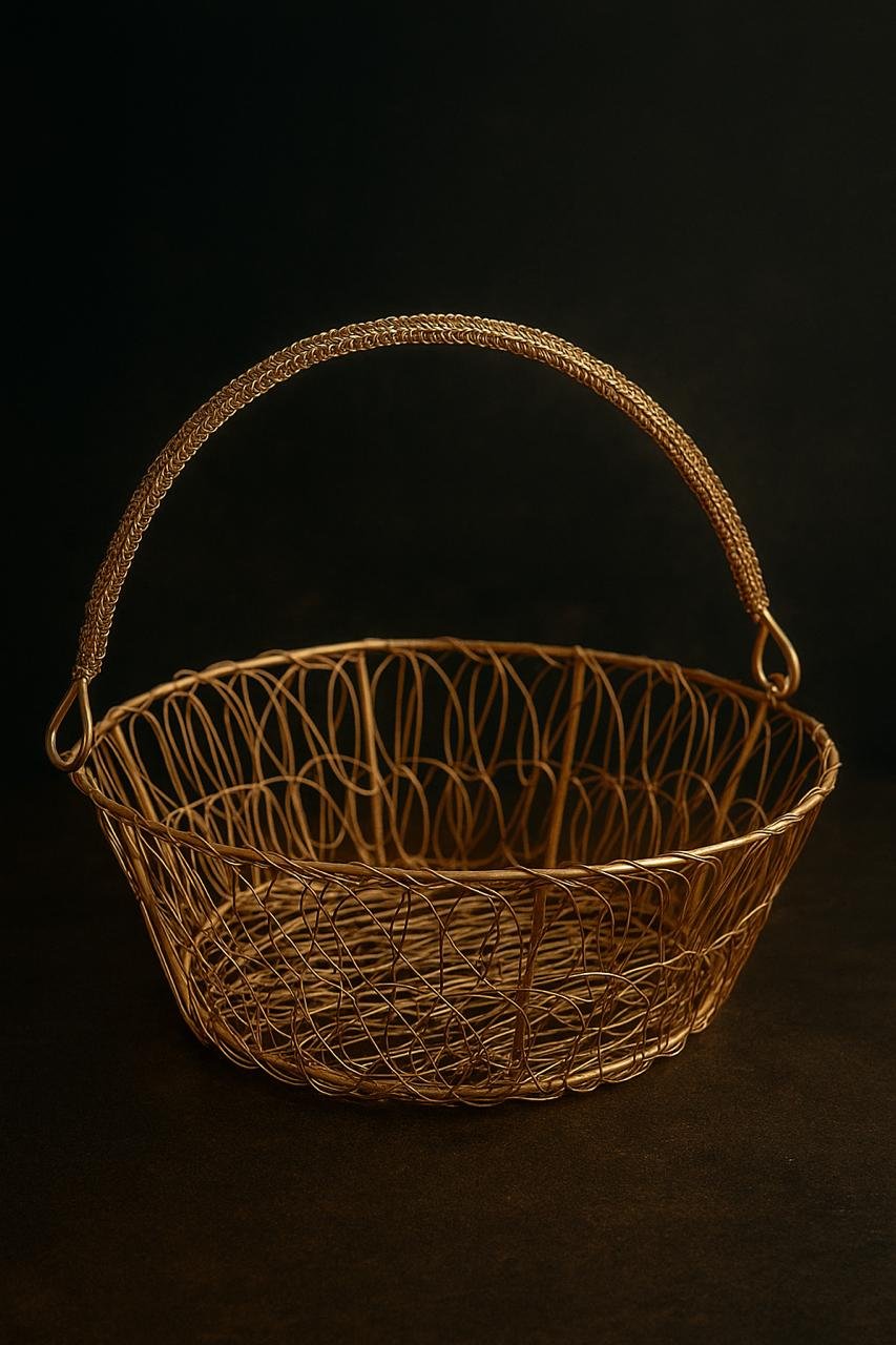 Decorative Metal Wire Basket, Gold, Round Fruit Bowl with Handle, Storage Container