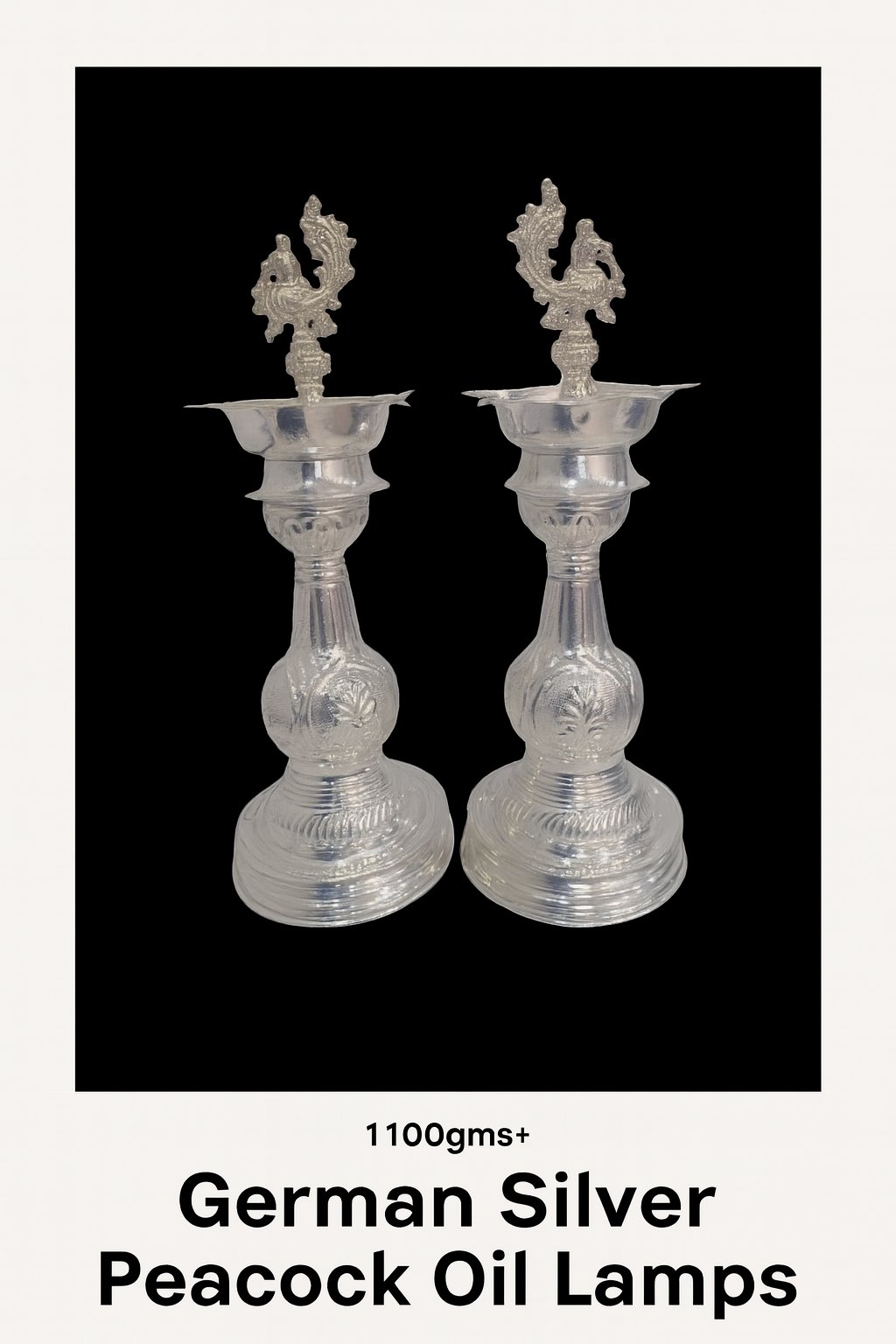 Illuminate your home with tradition and elegance using this exquisite German Silver Peacock Deepam Set. Crafted from premium-quality German silver and weighing over 1100 grams, this pair of oil lamps features a majestic peacock finial, detailed engraving, and a classic South Indian vilakku design. Perfect for pooja rooms, housewarming gifts, weddings, and festive decor, these lamps embody spiritual grace and timeless craftsmanship. The broad base ensures stability, while the deep bowl holds oil for extended lighting during rituals and ceremonies. Key Features: Material: German Silver Weight: 1100gms+ (pair) Design: Intricately carved with traditional motifs and peacock top Ideal For: Pooja, Festivals, Gifting, Home Decor