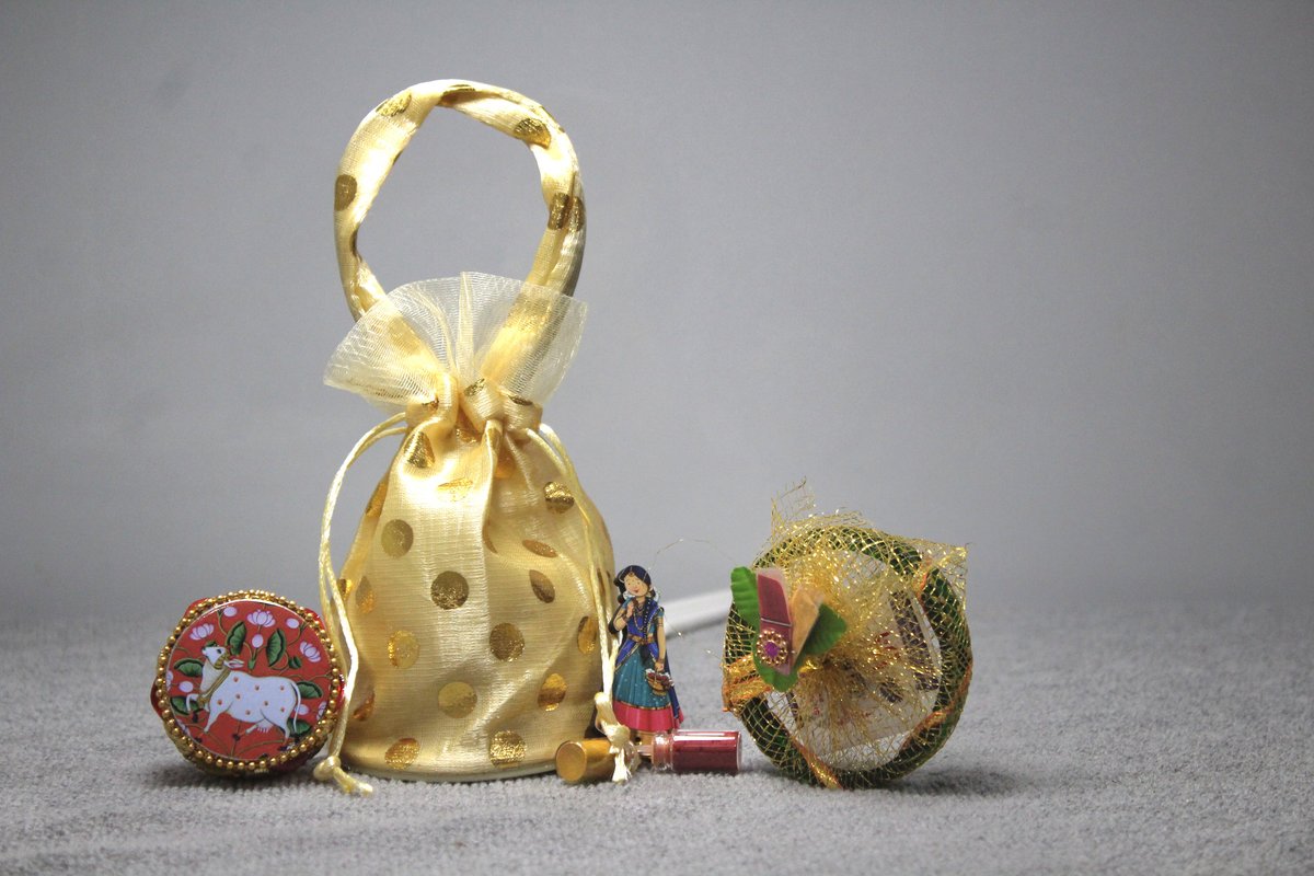Combo Details: 1 potli bag along with Pichwai design kumkum 4 Wrapped bangles 1 kumkum + haldi bottle