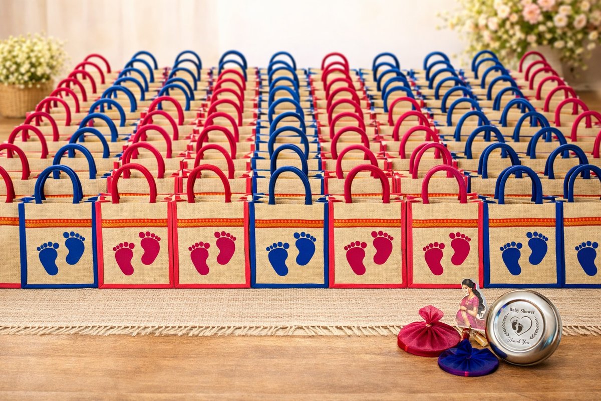 Make your baby shower celebration truly memorable with this beautiful pink-themed return gift combo, thoughtfully designed to blend tradition with elegance. This premium set includes a stylish jute bag with baby feet design, a 4.5-inch stainless steel box with customized “Baby Shower Thank You” print, along with haldi kumkum bottles and bangles — everything perfectly curated to delight your guests. The soft pink theme adds a warm, festive, and joyful touch, making it an ideal choice for baby shower (Seemantham) functions, especially for baby girl celebrations or pastel-themed events. Crafted with quality materials and attention to detail, this combo is not only visually appealing but also useful, reusable, and meaningful, leaving a lasting impression on your loved ones. ✨ Key Features 🎁 Complete Return Gift Combo – Ready-to-gift set for your function 🌸 Elegant Pink Theme – Adds a festive and traditional charm 🛍️ Premium Jute Bag (8×10×4 inches) – Durable, eco-friendly & reusable 🥣 4.5 Inch Steel Box – High-quality with customized baby shower print 🌼 Haldi Kumkum Bottles (2 pcs) – Traditional & auspicious 💫 Bangles Included – Perfect for baby shower rituals 🎉 Ideal for Seemantham / Baby Shower / Valaikappu Functions ✍️ Customization Available – Add your name or event details 📦 What’s Included 1 x Pink Jute Bag (Baby Feet Design) 1 x 4.5 Inch Steel Container (Customized Print) 2 x Haldi Kumkum Bottles 1 x Set of Bangles 💖 Why This Product Stands Out Beautiful combination of tradition + modern design Perfect for bulk gifting Enhances the premium feel of your event Loved by guests for its usefulness and presentation