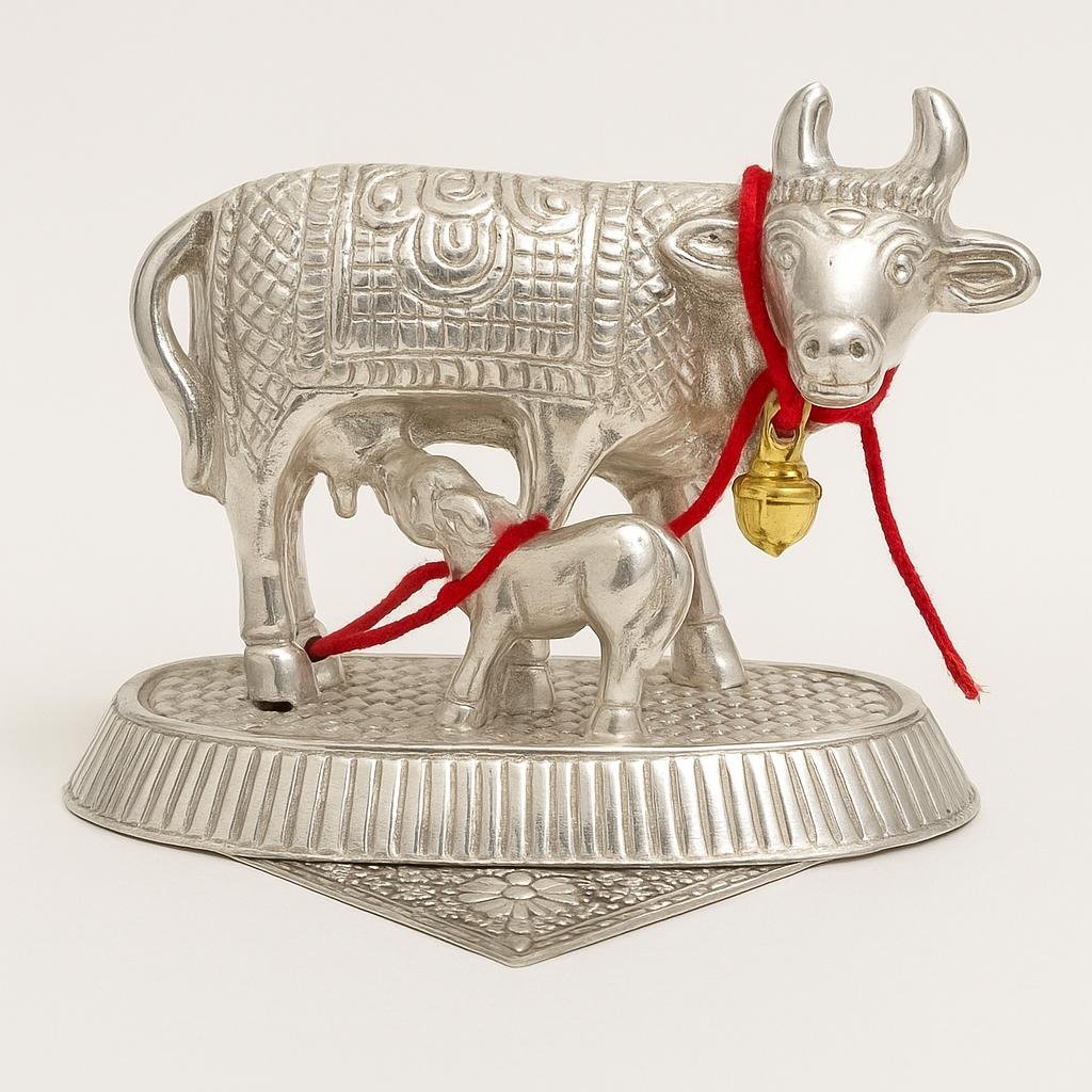 Silver Plated Kamdhenu Cow and Calf Statue - Kamadhenu Cow with Calf Vastu, Vastu Positive Energy Items for Home - Offers Wealth, Prosperity, Health, Peace (5 in), Idol